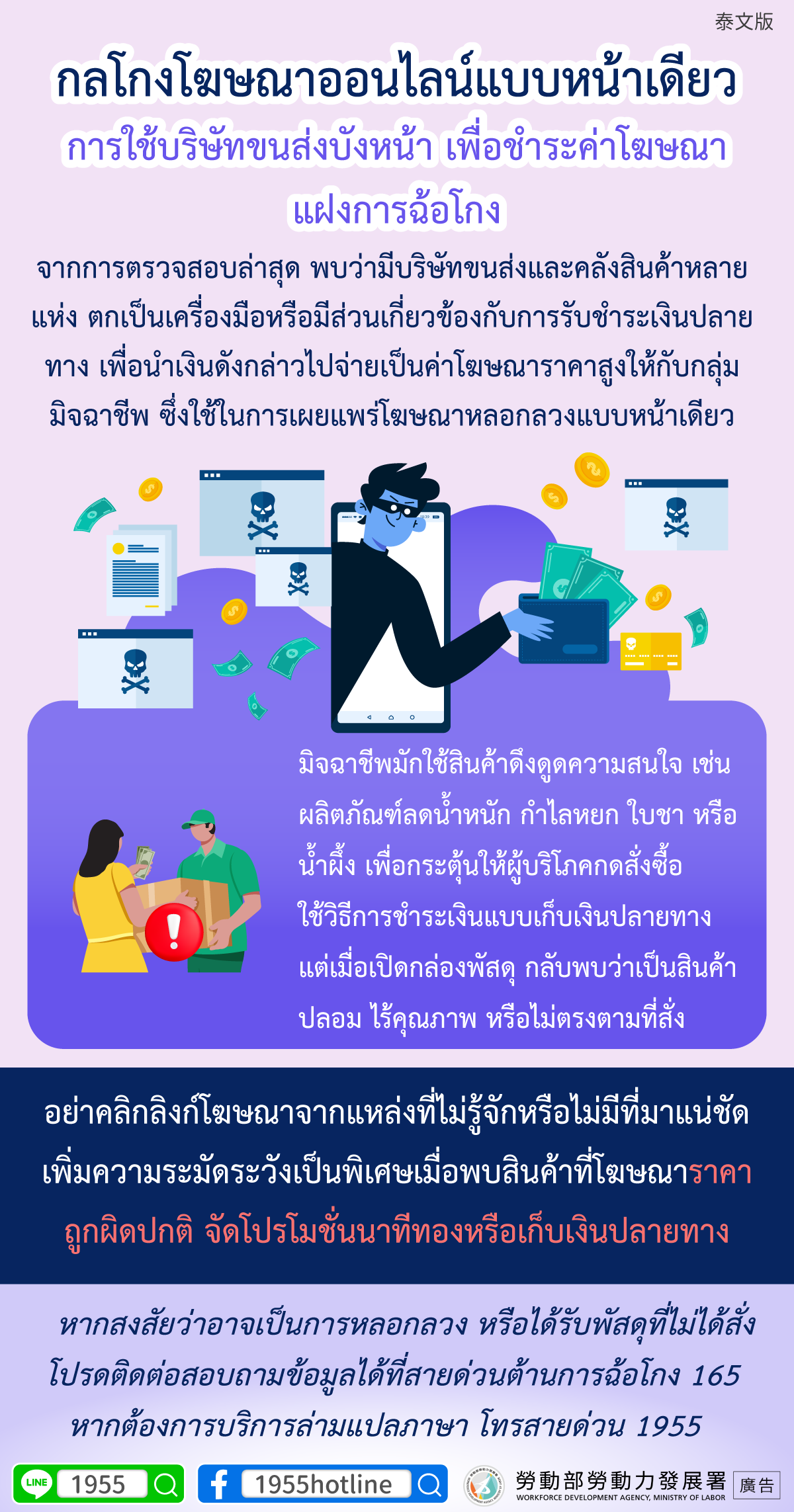 หากสงสัยว่าอาจเป็นการหลอกลวง หรือได้รับพัสดุที่ไม่ได้สั่ง โปรดติดต่อสอบถามข้อมูลได้ที่สายด่วนต้านการฉ้อโกง 165 หากต้องการบริการล่ามแปลภาษา โทรสายด่วน 1955