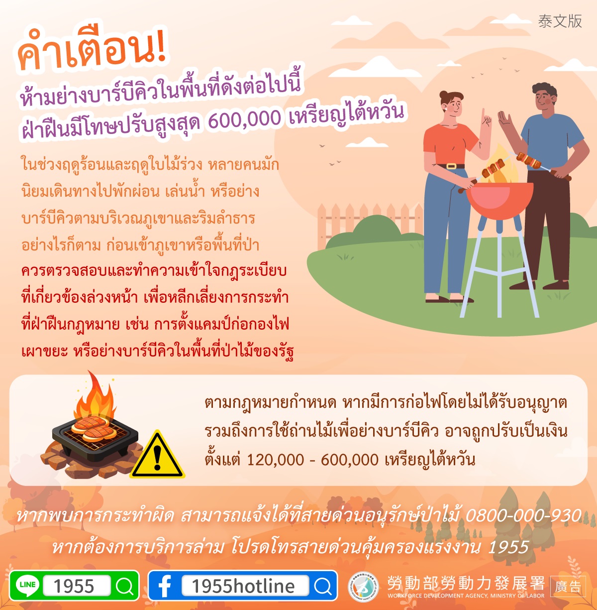 หากพบการกระทำผิด สามารถแจ้งได้ที่สายด่วนอนุรักษ์ป่าไม้ 0800-000-930หากต้องการบริการล่าม โปรดโทรสายด่วนคุ้มครองแรงงาน 1955