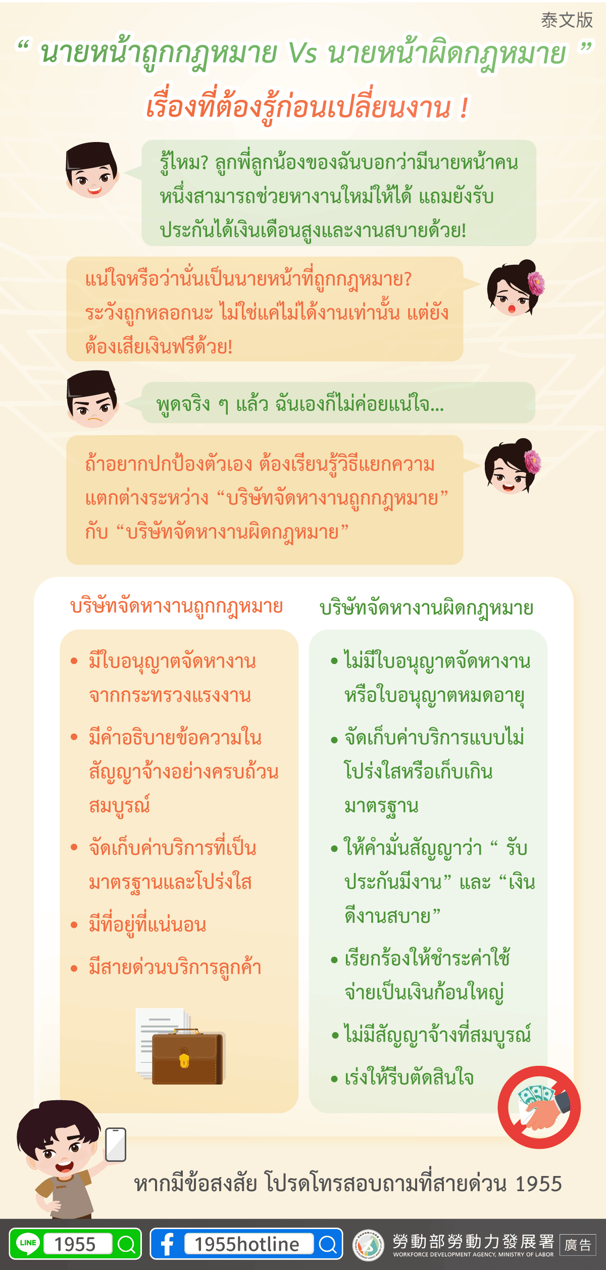 B:แน่ใจหรือว่านั่นเป็นนายหน้าที่ถูกกฎหมาย? ระวังถูกหลอกนะ ไม่ใช่แค่ไม่ได้งานเท่านั้น แต่ยังต้องเสียเงินฟรีด้วย!