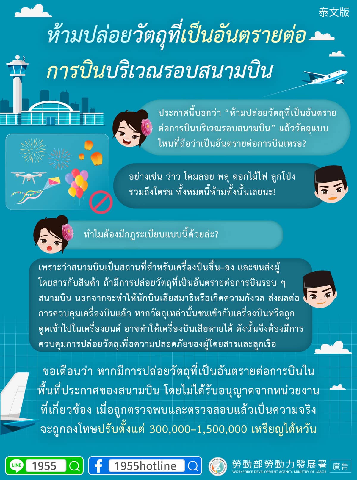 ขอเตือนว่า หากมีการปล่อยวัตถุที่เป็นอันตรายต่อการบินในพื้นที่ประกาศของสนามบิน โดยไม่ได้รับอนุญาตจากหน่วยงานที่เกี่ยวข้อง เมื่อถูกตรวจพบและตรวจสอบแล้วเป็นความจริง จะถูกลงโทษปรับตั้งแต่ 300,000–1,500,000 เหรียญไต้หวัน