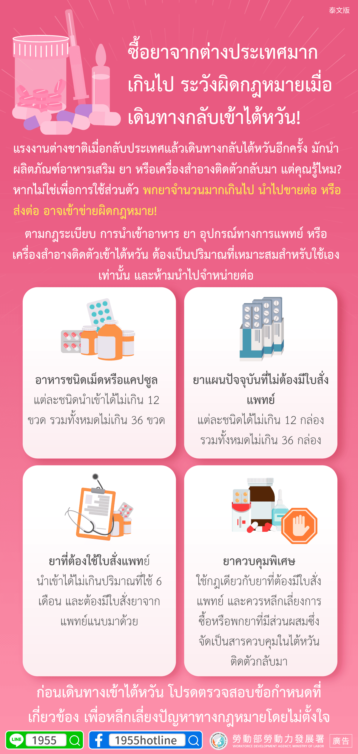 แรงงานต่างชาติเมื่อกลับประเทศแล้วเดินทางกลับไต้หวันอีกครั้ง มักนำผลิตภัณฑ์อาหารเสริม ยา หรือเครื่องสำอางติดตัวกลับมา แต่คุณรู้ไหม? หากไม่ใช่เพื่อการใช้ส่วนตัว พกยาจำนวนมากเกินไป นำไปขายต่อ หรือส่งต่อ อาจเข้าข่ายผิดกฎหมาย!