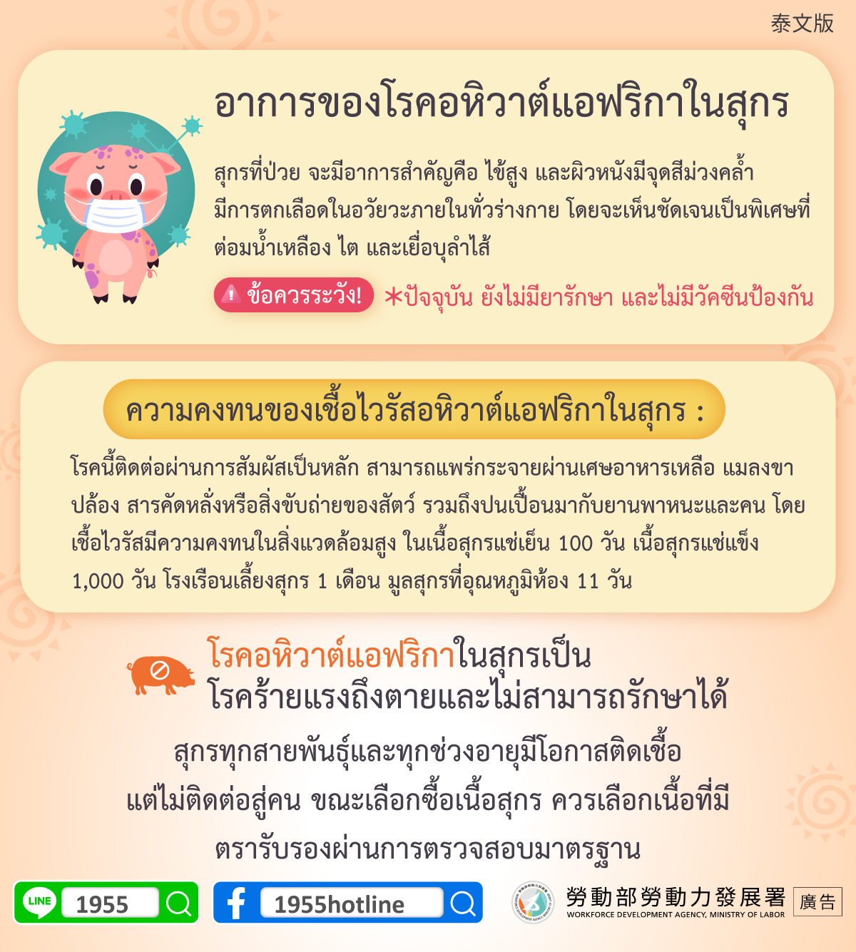 (FWA 2026/03/09)สุกรที่ป่วย จะมีอาการสำคัญคือ ไข้สูง และผิวหนังมีจุดสีม่วงคล้ำมีการตกเลือดในอวัยวะภายในทั่วร่างกาย โดยจะเห็นชัดเจนเป็นพิเศษที่ต่อมน้ำเหลือง ไต และเยื่อบุลำไส้