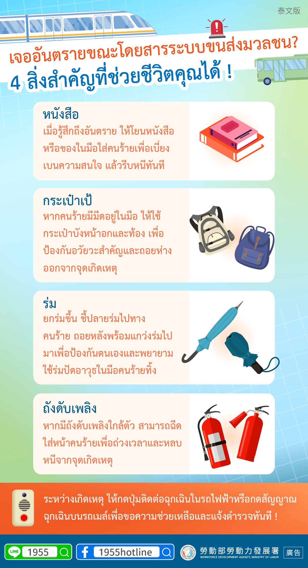 ระหว่างเกิดเหตุ ให้กดปุ่มติดต่อฉุกเฉินในรถไฟฟ้าหรือกดสัญญาณฉุกเฉินบนรถเมล์เพื่อขอความช่วยเหลือและแจ้งตำรวจ
