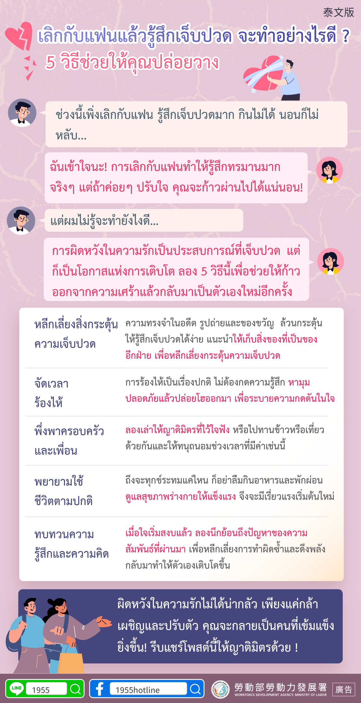 B:ฉันเข้าใจนะ! การเลิกกับแฟนทำให้รู้สึกทรมานมากจริงๆ แต่ถ้าค่อยๆ ปรับใจ คุณจะก้าวผ่านไปได้แน่นอน!