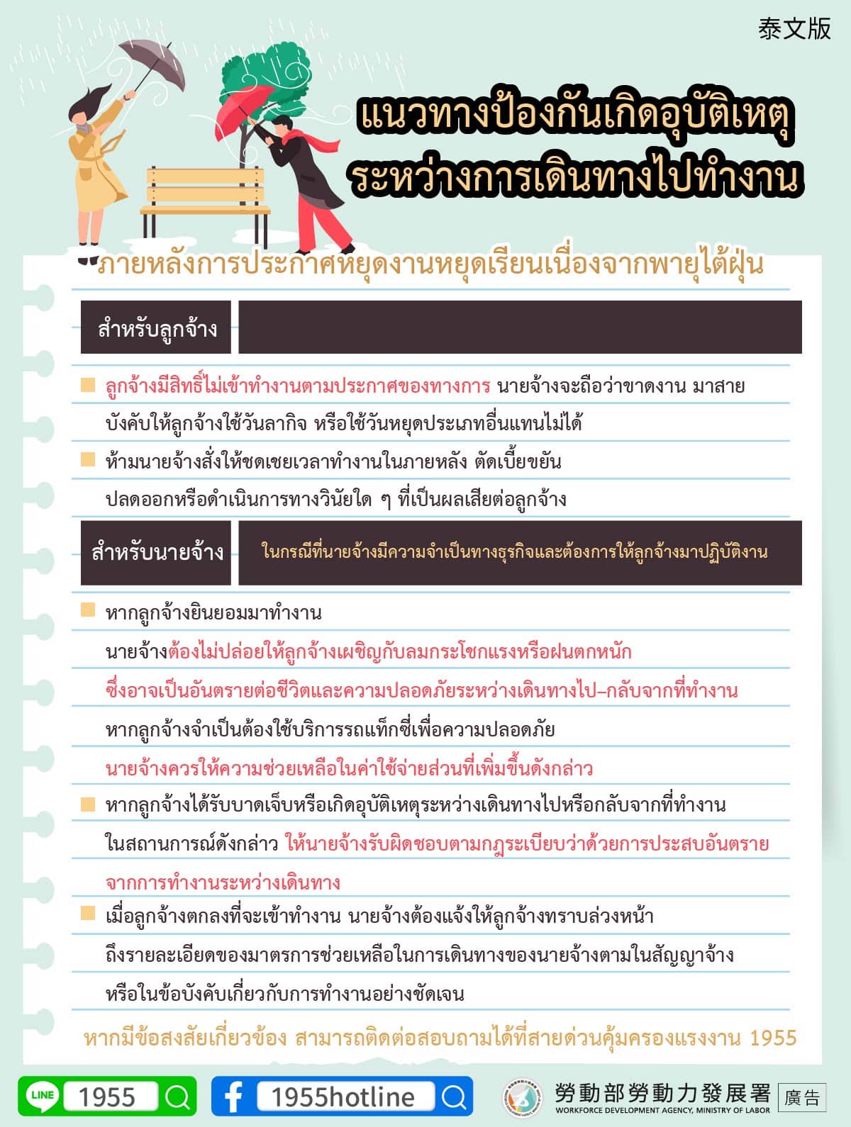 •หากลูกจ้างยินยอมมาทำงาน นายจ้างต้องไม่ปล่อยให้ลูกจ้างเผชิญกับลมกระโชกแรงหรือฝนตกหนัก ซึ่งอาจเป็นอันตรายต่อชีวิตและความปลอดภัยระหว่างเดินทางไป–กลับจากที่ทำงาน หากลูกจ้างจำเป็นต้องใช้บริการรถแท็กซี่เพื่อความปลอดภัย นายจ้างควรให้ความช่วยเหลือในค่าใช้จ่ายส่วนที่เพิ่มขึ้นดังกล่าว