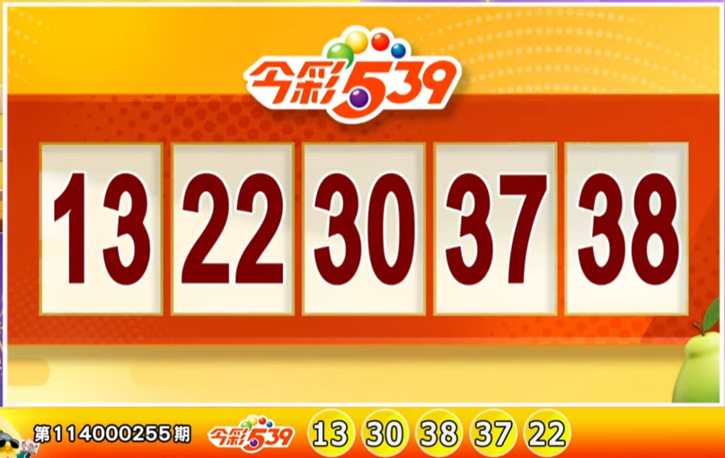 (FWA 2025/10/21) ผลการออกรางวัลหวย 539 งวดที่ 114000255 คือ 13, 22, 30, 37, 38 รางวัลที่หนึ่ง (ถูกทั้ง 5 หมายเลข) คือเงินรางวัล 8 ล้านดอลลาร์ไต้หวัน การออกรางวัลหวย 539 มีขึ้นทุกวันจันทร์ถึงวันเสาร์ เวลา 20:30 น. (หมายเลขที่ออกรางวัลจริงจะยึดตามประกาศอย่างเป็นทางการของลอตเตอรี่ไต้หวัน)