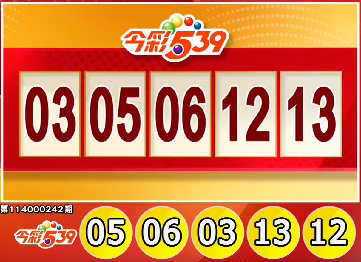 (FWA 2025/10/6) ผลการออกรางวัลหวย 539 งวดที่ 114000242 คือ 03, 05, 06, 12, 13 รางวัลที่หนึ่ง (ถูกทั้ง 5 หมายเลข) คือเงินรางวัล 8 ล้านดอลลาร์ไต้หวัน การออกรางวัลหวย 539 มีขึ้นทุกวันจันทร์ถึงวันเสาร์ เวลา 20:30 น. (หมายเลขที่ออกรางวัลจริงจะยึดตามประกาศอย่างเป็นทางการของลอตเตอรี่ไต้หวัน)