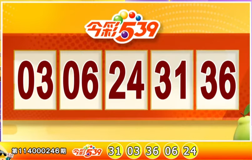 (FWA 2025/10/10) ผลการออกรางวัลหวย 539 งวดที่ 114000246 คือ 03, 06, 24, 31, 36 รางวัลที่หนึ่ง (ถูกทั้ง 5 หมายเลข) คือเงินรางวัล 8 ล้านดอลลาร์ไต้หวัน การออกรางวัลหวย 539 มีขึ้นทุกวันจันทร์ถึงวันเสาร์ เวลา 20:30 น. (หมายเลขที่ออกรางวัลจริงจะยึดตามประกาศอย่างเป็นทางการของลอตเตอรี่ไต้หวัน)