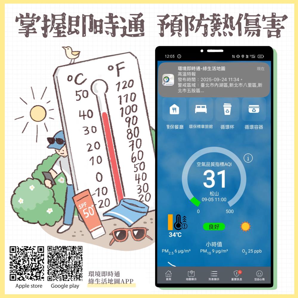 【編輯部2025年9月25日綜合報導】「環境即時通」APP即時提供空氣品質、天氣,十大類便民綠生活設施等資訊,更結合了最新空品標準的智慧預警機制與多元的環境設施查詢服務。因應氣候變遷導致臺灣夏季變得越來越炎熱、漫長,高溫對民眾健康與日常生活造成不小影響,特別新增了「高溫警示」新功能,歡迎大家趕快下載體驗。