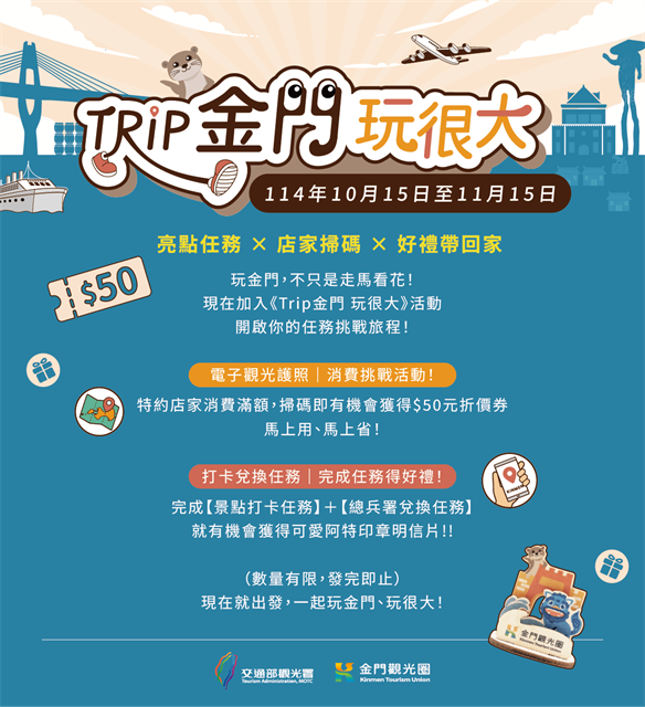 【編輯部2025年10月14日綜合報導】「Trip金門玩很大」活動自10月15日登場至11月15日,金門觀光圈產業聯盟夥伴共同響應,期望透過整合行銷擴大宣傳,帶動觀光與消費。活動推出「電子觀光護照|消費挑戰活動!」及「打卡兌換任務|完成任務得好禮!」的雙重任務挑戰,讓遊客在暢遊金門拍照打卡的同時,還可以享受滿滿好康。