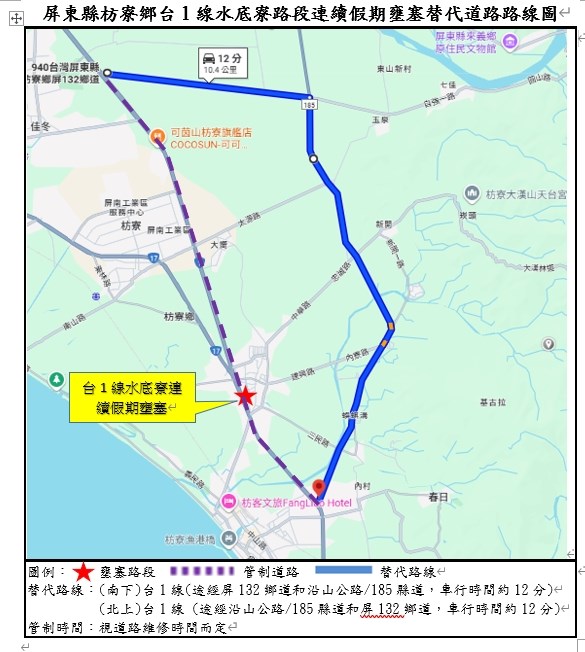 公路局南區養護工程分局楓港工務段表示,恆春地區為國內熱門旅遊景點,連假期間預估將湧現大量旅遊車潮,為紓解龐大車流,相關疏導措施如下: