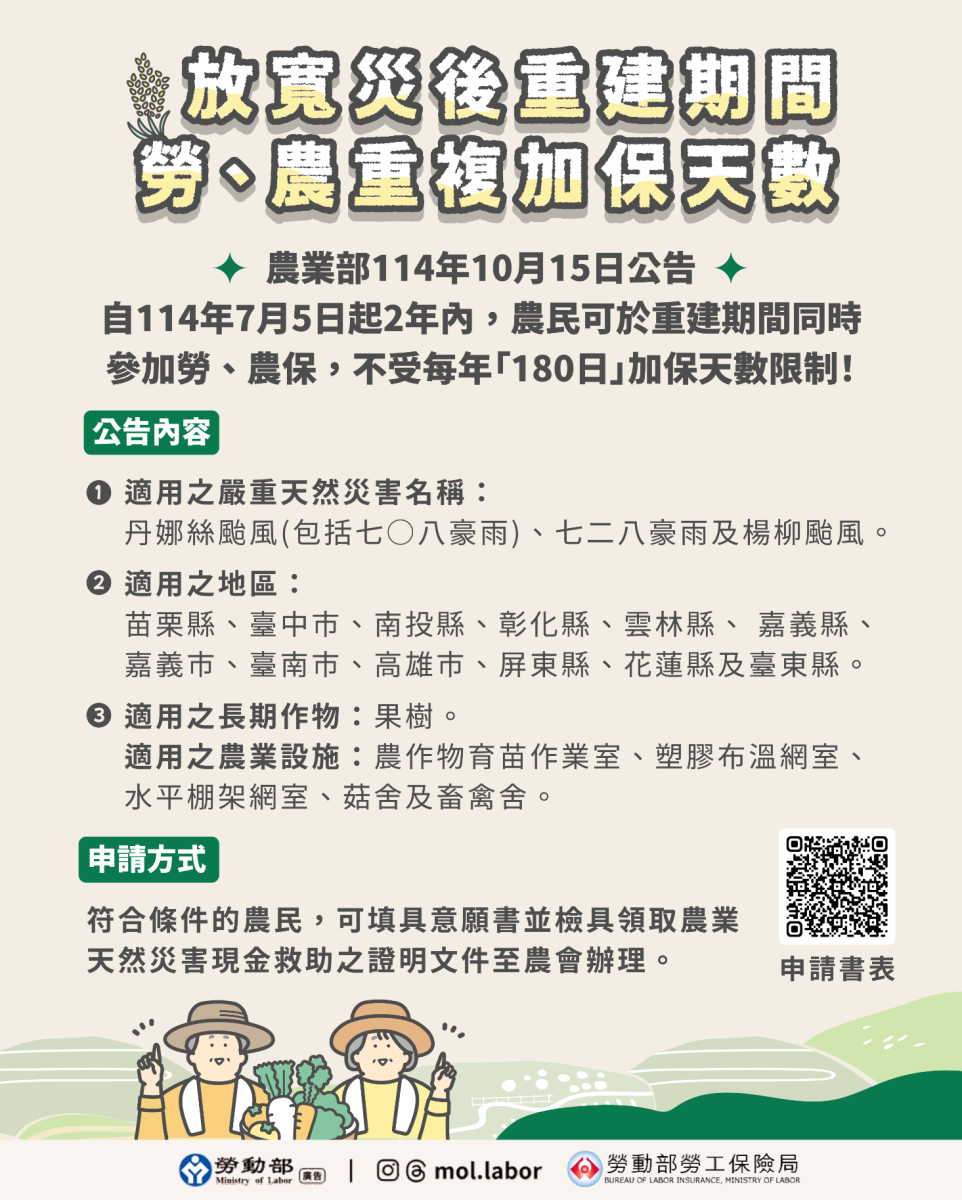 【外勞社記者黃秀娟2025年11月28日報導】勞動部勞工保險局指出,符合公告資格並領取農業天然災害現金救助的農民,自114年7月5日丹娜絲颱風侵襲日算起,在未來2年內再從事非農業工作時,可不受「勞農重…<詳全文>