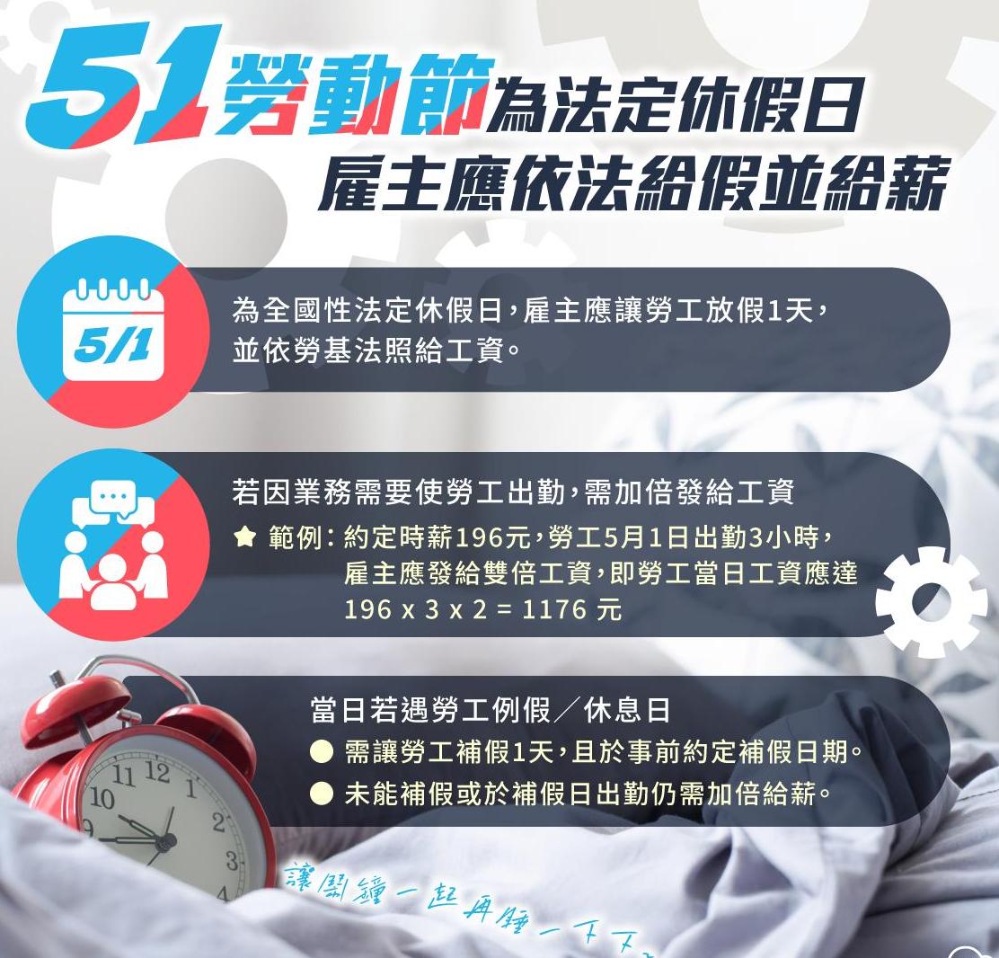 新聞勞動節全國統一放假 出勤應加給工資 FWA 編輯部 1 天 ago share【外勞社記者楊孝慈2026年4月28日報導】《紀念日及節日實施條例》修法後,勞動節今年已正式納入全國國定假日,統一放假一天。新北市政府勞工局提醒雇主應給予勞工休假,並依法照給工資;雇主若因業務需要,有…<詳全文>想了解更多資訊?加入會員-暢讀所有內容訂閱