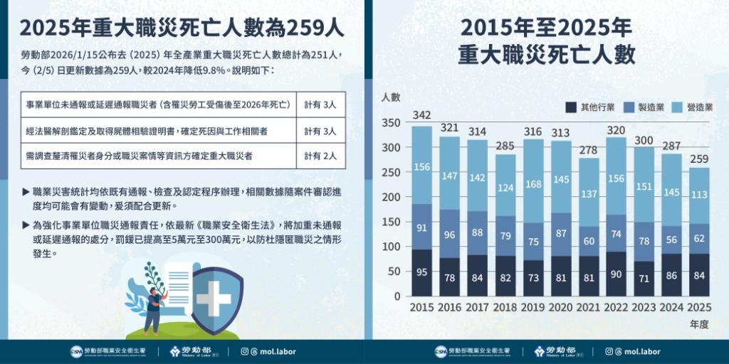 觀點勞動部更新重大職災統計 死亡259人創歷年新低勞動部更新重大職災統計 死亡259人創歷年新低 FWA 編輯部 2 天 ago share【外勞社記者黃秀娟2026年2月5日報導】勞動部日前更新公布全國各縣市政府重大職業災害死亡人數統計,原先公布的死亡人數為251人,經重新檢視後修正為259人,仍為歷年來最低水準,較113年下降9.8%…<詳全文>想了解更多資訊?加入會員-暢讀所有內容訂閱