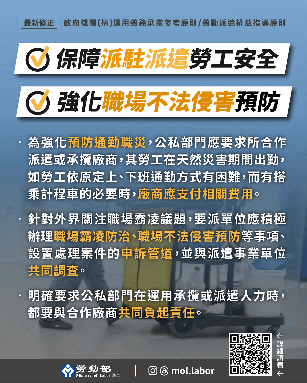 【外勞社記者黃秀娟2025年9月23日報導】勞動部23日修正發布勞務承攬及勞動派遣等相關行政指引,明確規範天然災害發生時,承攬廠商及要派單位如有派駐(遣)勞工出勤之必要,必須提供通勤協助,包括支付勞工…<詳全文>