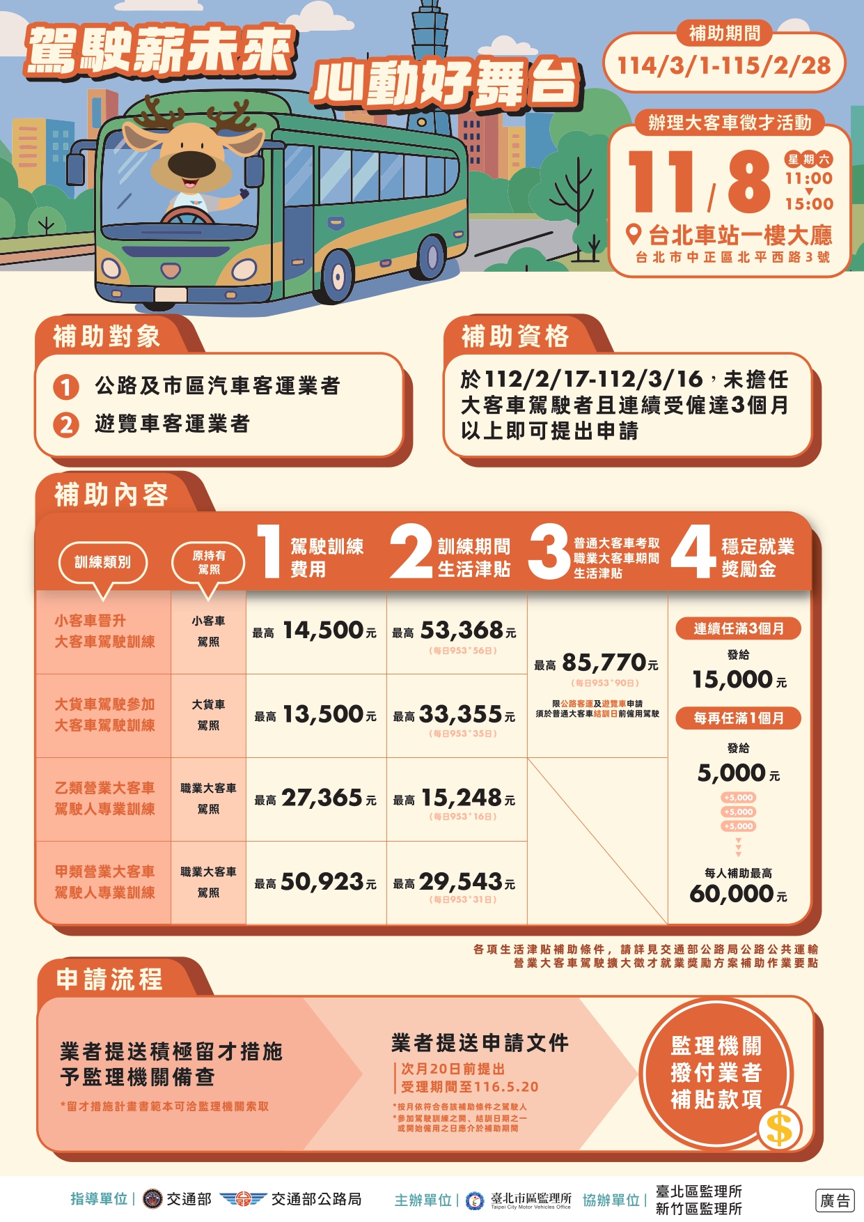 為鼓勵更多新進人員投入客運行列,政府推出多項就業補助措施,最高可領取21萬3,000元,包括駕訓費用補助、訓練期間生活津貼及穩定就業獎勵金等,協助新手駕駛順利考取職業大客車駕照、安心投入就業。