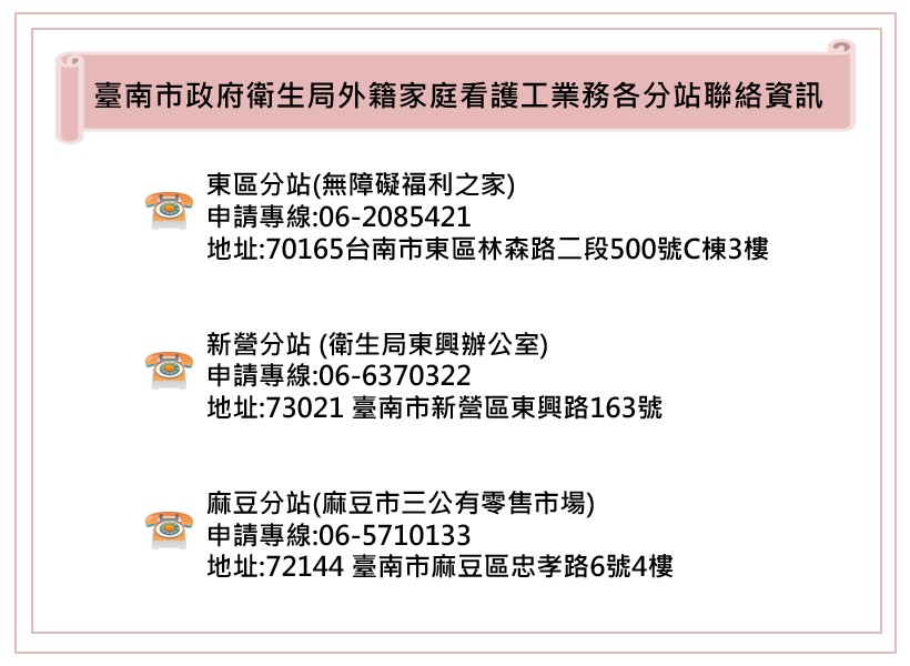 生活台南市外籍看護申審 增加麻豆分站 三據點分區審查 協助案件有效分流 FWA 編輯部 2 天 ago share【外勞社記者楊孝慈2026年2月2日報導】為提升服務量能,便利民眾辦理外籍家庭看護工申審相關業務,台南市政府衛生局自即日起除原有的新營、東區受理區域外,今年起再增設麻豆分站受理案件,服務麻豆、佳里等1…<詳全文>想了解更多資訊?加入會員-暢讀所有內容訂閱