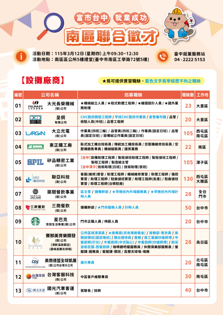 邀請大光長榮機械、矽品精密、三商餐飲、築間餐飲及清新溫泉等13家廠商徵才,提供超過600個工作機會,歡迎踴躍參加。