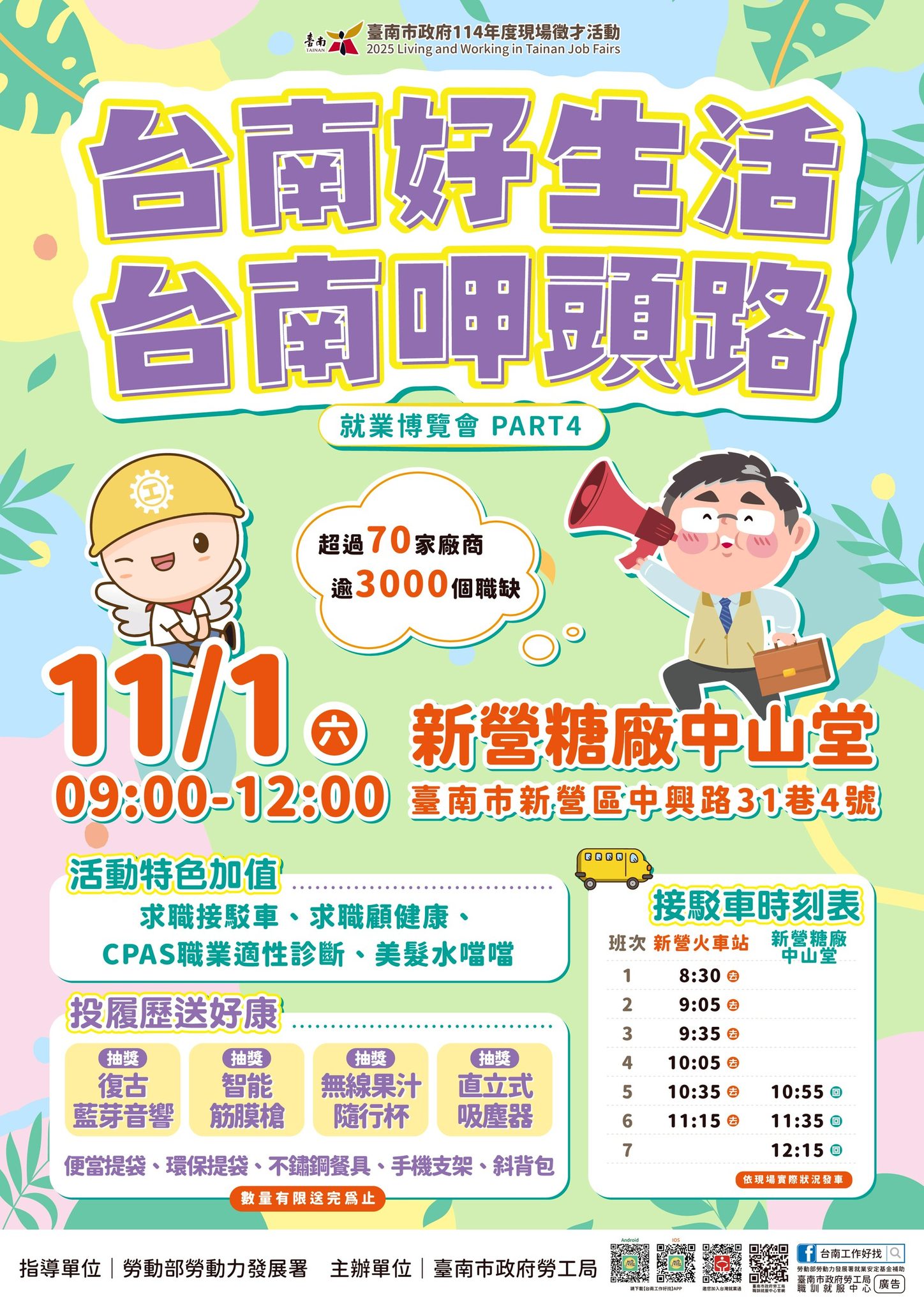 2025「台南好生活 台南呷頭路」第4場大型就業博覽會,將在11月1日(週六)上午9時至12時於新營區新營糖廠中山堂辦理,當日超過70家廠商,提供逾3000個工作機會;活動當天有「投履歷送好康」、「CPAS職業適性診斷」、「履歷健診」、「求職顧健康」、「按摩紓壓」及「美髮水噹噹」等多項免費服務,並可抽直立式吸塵器等好禮,詳洽:06-6330820。