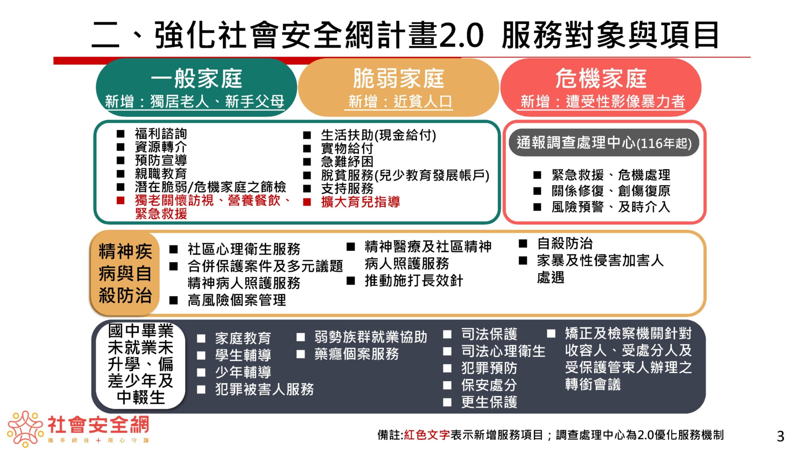 【外勞社記者楊孝慈2025年12月18日報導】衛生福利部12月18日於行政院會報告「強化社會安全網計畫2.0(115-119年)」,未來5年將投入819億餘元預算,並將獨居老人、近貧人口、新手父母等納入前端初級預防服務對象。