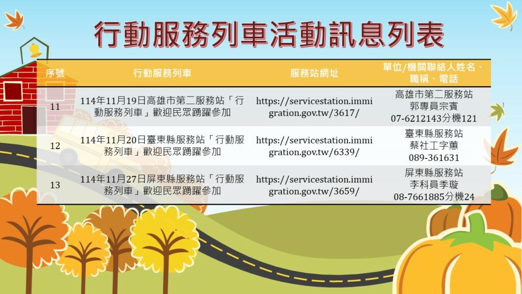 【外勞社消息】內政部移民署南區事務大隊所屬各服務站預訂於114年11月1日至30日期間辦理「行動服務列車」,該行動服務列車提供因交通不便,而無法前來服務站之偏鄉新住民申辦各項申請案及送證之服務,以減少新住民及其家屬長途跋涉、舟車勞頓;並提供新住民培力計畫相關資訊、外來人士在臺生活諮詢專線、相關法令與政策等服務。