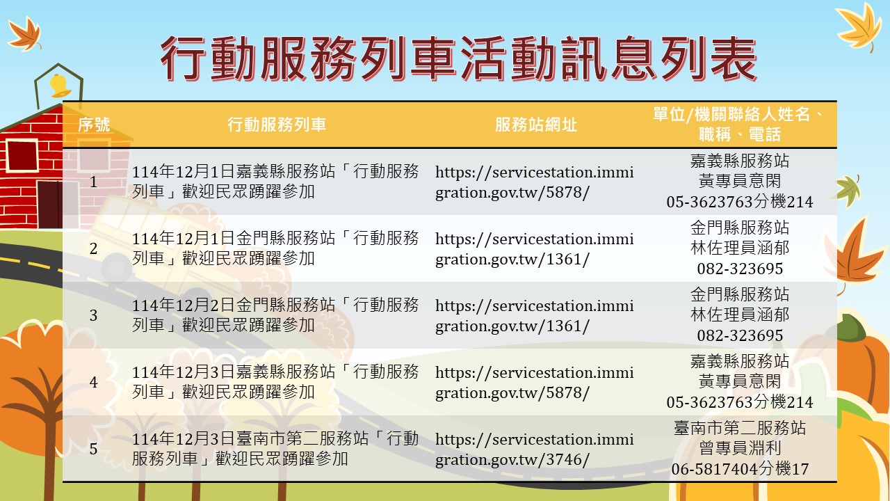 【外勞社消息】內政部移民署南區事務大隊所屬各服務站預訂於114年12月1日至31日期間辦理「行動服務列車」,該行動服務列車提供因交通不便,而無法前來服務站之偏鄉新住民申辦各項申請案及送證之服務,以減少新住民及其家屬長途跋涉、舟車勞頓;並提供新住民培力計畫相關資訊、外來人士在臺生活諮詢專線、相關法令與政策等服務。
