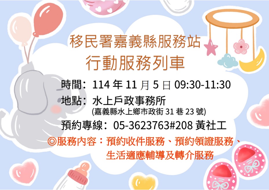 【外勞社消息】移民署嘉義縣服務站行動服務列車將於114年11月5日9時30分至11時30分到水上戶政事務所(地址: 嘉義縣水上鄉市政街31巷23號)提供駐點服務,歡迎有需要的民眾來電預約,預約電話:05-3623763分機208黃社工。