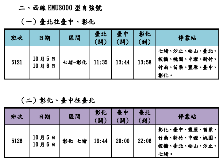 【編輯部2025年10月1日綜合報導】因應中秋連假期間返鄉(工)需求增加,為加強服務旅客,於114年10月5日至10月6日加開七堵=彰化EMU 3000型自強號4列次、10月6日加開樹林=花蓮太魯閣號2列次,可再增加座位數共計2,904個,整體運能較平日增加6.2%。