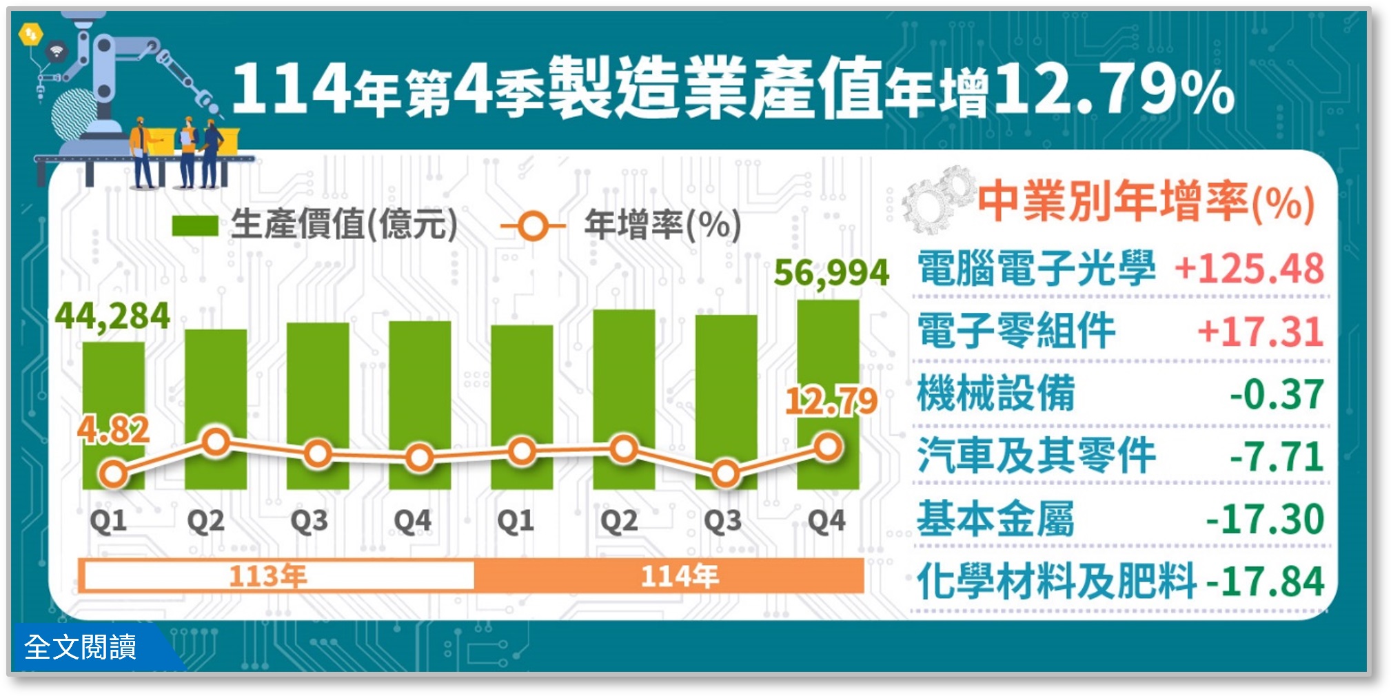 產經製造業年產值突破21兆元 連兩年成長 FWA 編輯部 3 天 ago share【外勞社記者楊孝慈2026年3月2日報導】經濟部統計,2025年第四季製造業產值達到5兆6,994億元,較2024年同季增加12.79%,為連續八季正成長。2025年全年產值達21.3兆元,首度突破2…<詳全文>想了解更多資訊?加入會員-暢讀所有內容訂閱