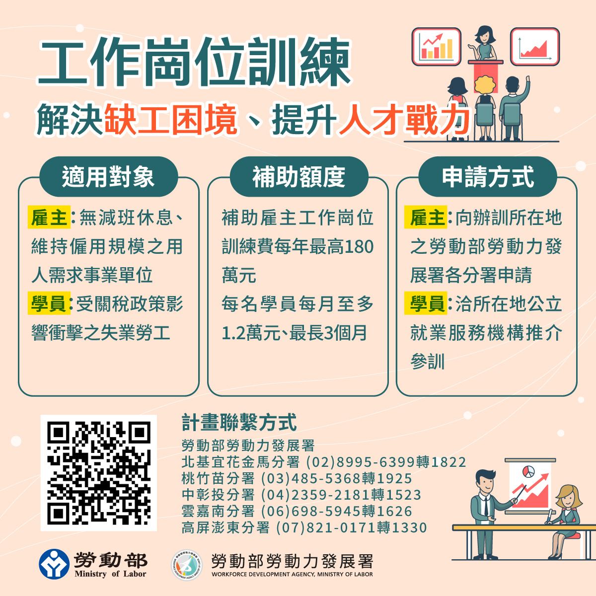 勞動力發展署自114年9月30日起,整合「工作崗位訓練」資源,只要雇主僱用受國際情勢影響的失業勞工,同一年度內單一雇主最高可獲得180萬元訓練補助,透過「邊做邊學」模式,協助企業快速培育所需的即戰力。