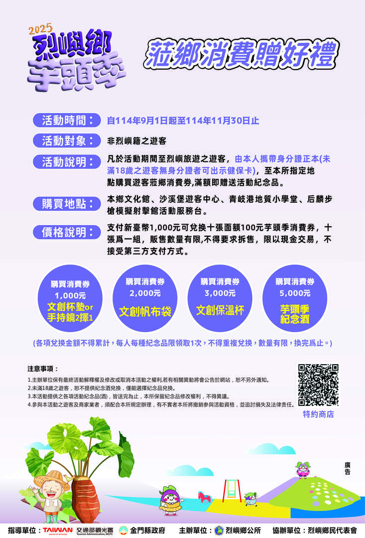 金門觀光圈始終秉持著「共創共好」的精神,期盼透過參與在地節慶,串聯更多特色店家,讓遊客能更深入地體驗金門的多元魅力。誠摯邀請所有民眾,在10月10日至11日,前來烈嶼,在芋香與人情味交織的市集中,與我們一同相「芋」在烈嶼。