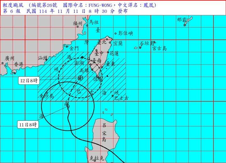 根據氣象署8:30警報,颱風鳳凰(國際命名FUNG-WONG)11日8時的中心位置在北緯19.6度,東經118.4度,即在鵝鑾鼻的西南方約360公里之處,以每小時12公里速度,向北北東轉東北進行。