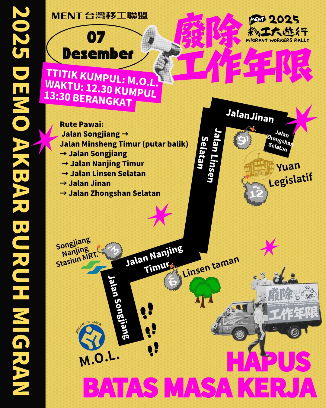 (FWA 2025/11/28)Aliansi Migran Taiwan (MENT) akan menggelar 2025 DEMO AKBAR BURUH MIGRAN dua tahunan pada tanggal 7 Desember. Tuntutan utama kali ini adalah “Hapus batas masa kerja” (khususnya aturan 12 tahun) bagi pekerja migran kerah biru (blue-collar).