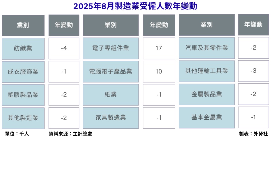 受僱員工人數方面,8月紡織業年減4千人、其他運輸製造業年減3千人、塑膠製品製造業年減2千人、金屬製品製造業年減2千人、汽車業年減2千人;此外成衣、木竹、紙業、印刷、化學材料、基本金屬、家具等製造業也都出現年減千人的情況。