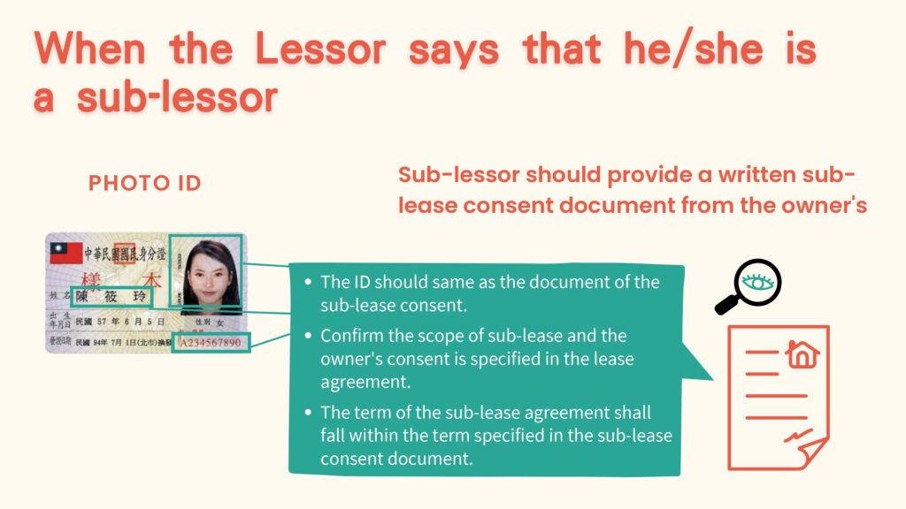 • Verification points: The ID should be the same as the person named in the sub-lease consent document. Confirm the scope and term of the sub-lease fall within what the owner has consented to.