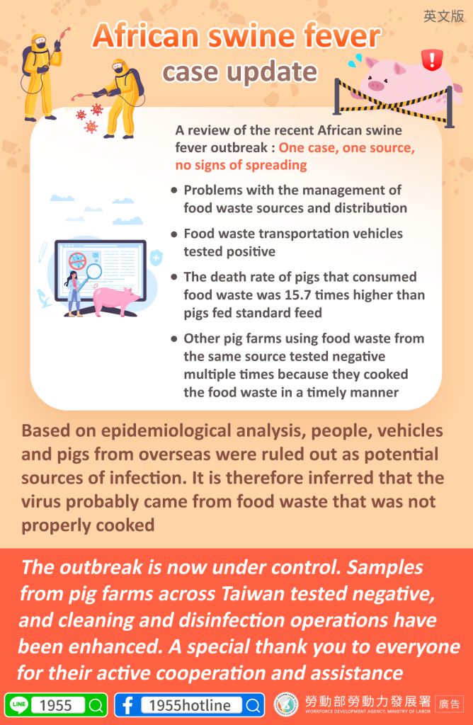 The outbreak is now under control. Samples from pig farms across Taiwan tested negative, and cleaning and disinfection operations have been enhanced. A special thank you to everyone for their active cooperation and assistance