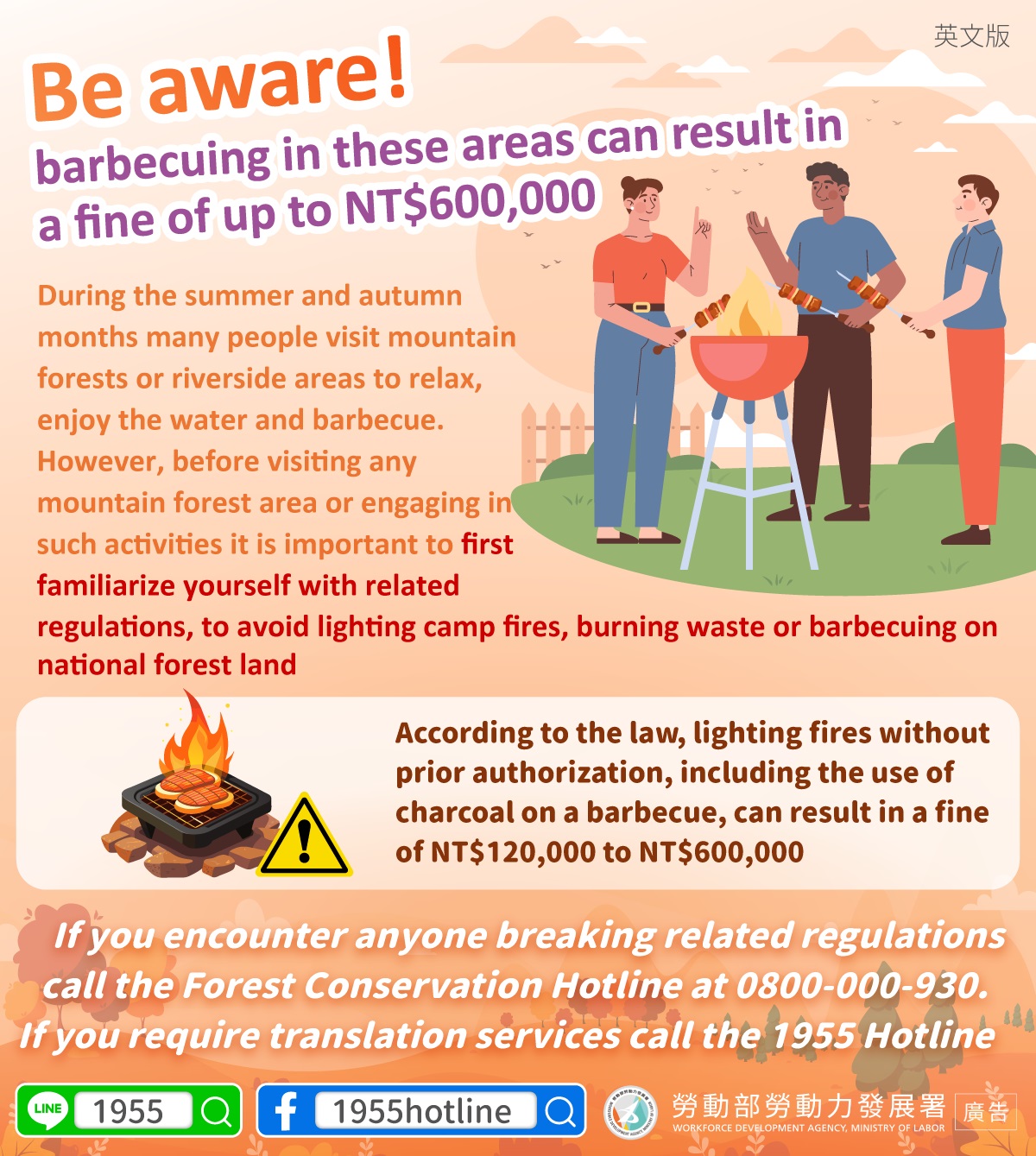 According to the law, lighting fires without prior authorization, including the use of charcoal on a barbecue, can result in a fine of NT$120,000 to NT$600,000