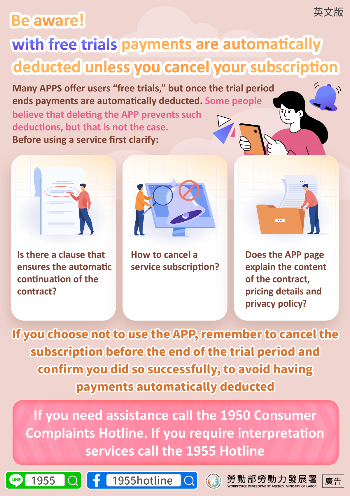 如需協助,請撥打消費者保護專線1950,如需通譯服務請撥打1955