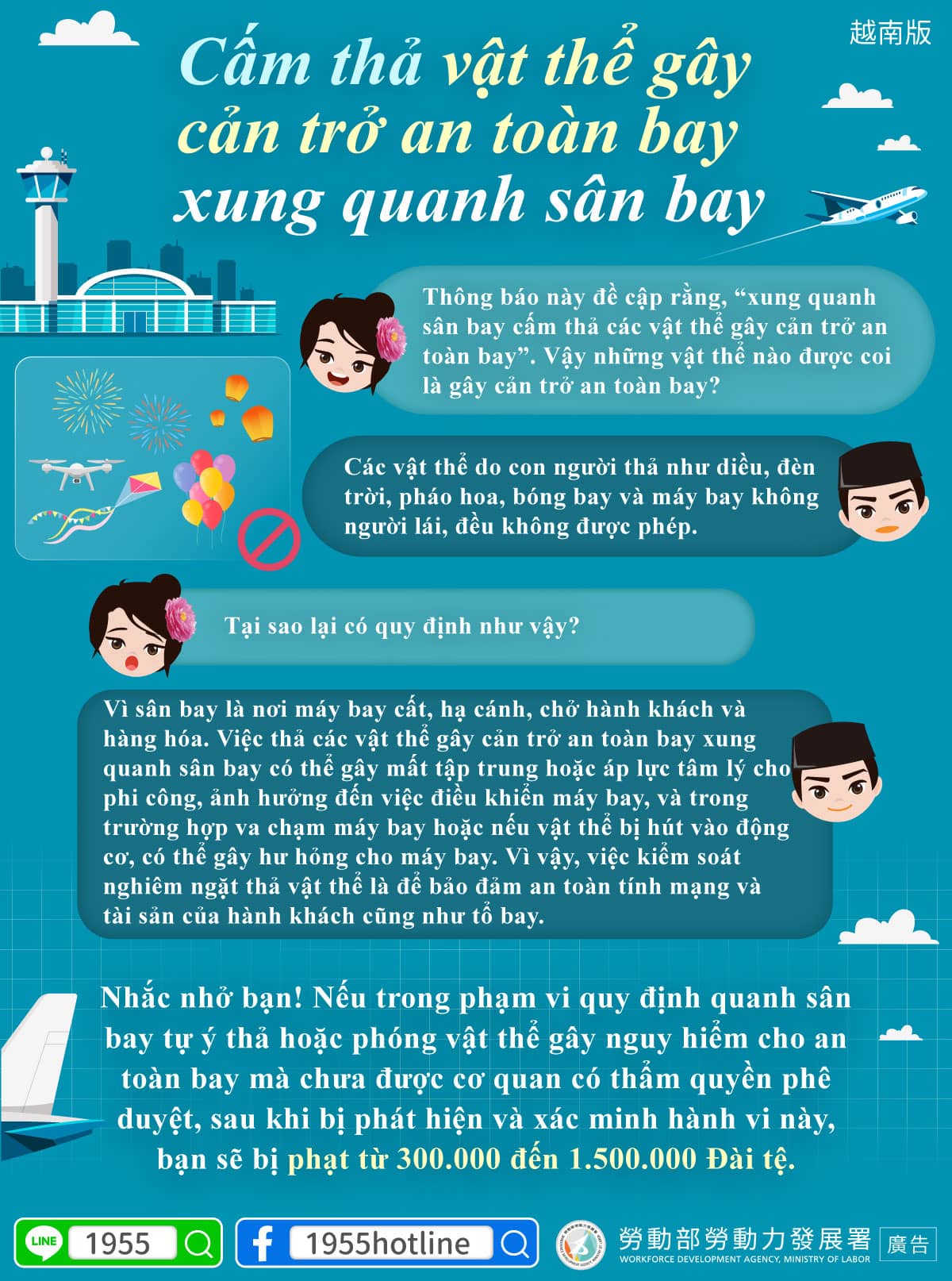 Nhắc nhở bạn! Nếu trong phạm vi quy định quanh sân bay tự ý thả hoặc phóng vật thể gây nguy hiểm cho an toàn bay mà chưa được cơ quan có thẩm quyền phê duyệt, sau khi bị phát hiện và xác minh hành vi này, bạn sẽ bị phạt từ 300.000 đến 1.500.000 Đài tệ.