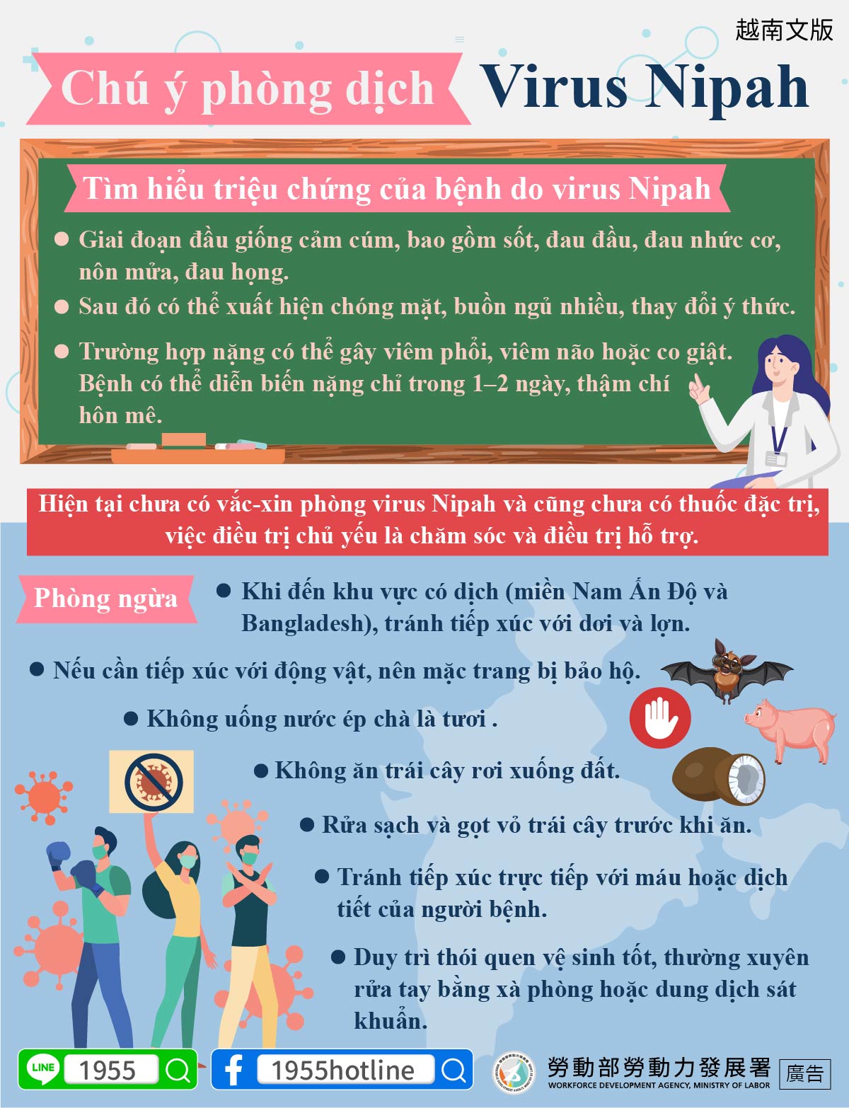 •Khi đến khu vực có dịch (miền Nam Ấn Độ và Bangladesh), tránh tiếp xúc với dơi và lợn.