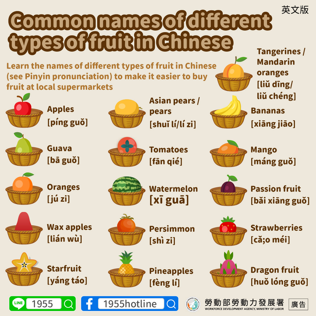 Learn the names of different types of fruit in Chinese (see Pinyin pronunciation) to make it easier to buy fruit at local supermarkets