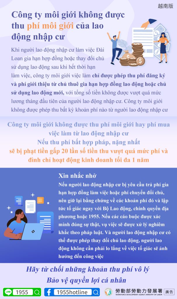 (FWA 2026/02/23)Khi người lao động nhập cư làm việc Đài Loan gia hạn hợp đồng hoặc thay đổi chủ sử dụng lao động sau khi hết thời hạn làm việc, công ty môi giới việc làm chỉ được phép thu phí đăng ký và phí giới thiệu từ chủ thuê gia hạn hợp đồng lao động hoặc chủ sử dụng lao động mới, với tổng số tiền không được vượt quá mức lương tháng đầu tiên của người lao động nhập cư. Công ty môi giới không được phép thu bất kỳ khoản phí nào từ người lao động nhập cư