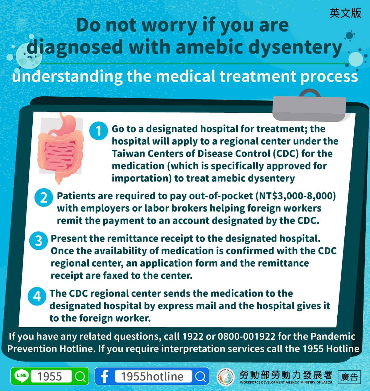 1.Go to a designated hospital for treatment; the hospital will apply to a regional center under the Taiwan Centers of Disease Control (CDC) for the medication (which is specifically approved for importation) to treat amebic dysentery