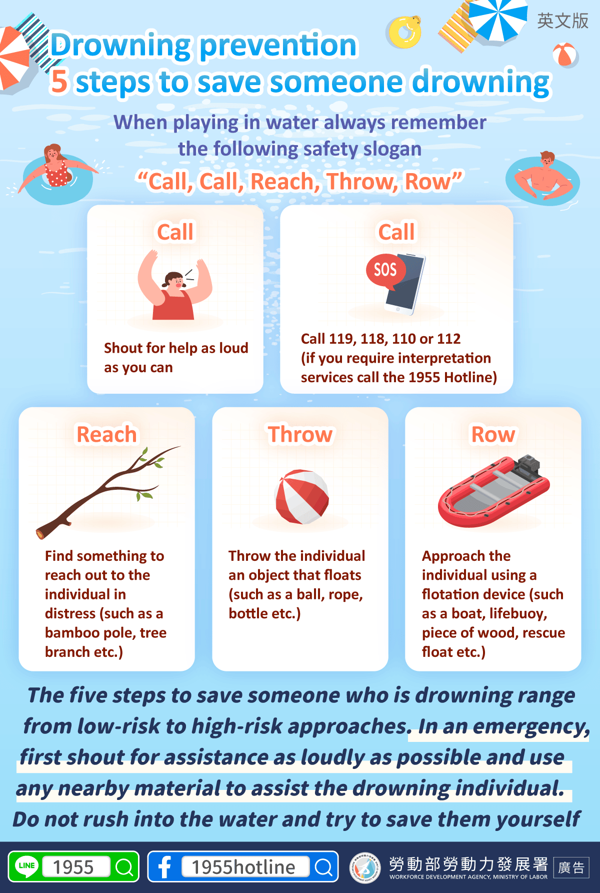 第一時間務必大聲求援,利用周圍救生器材,切勿貿然下水救人