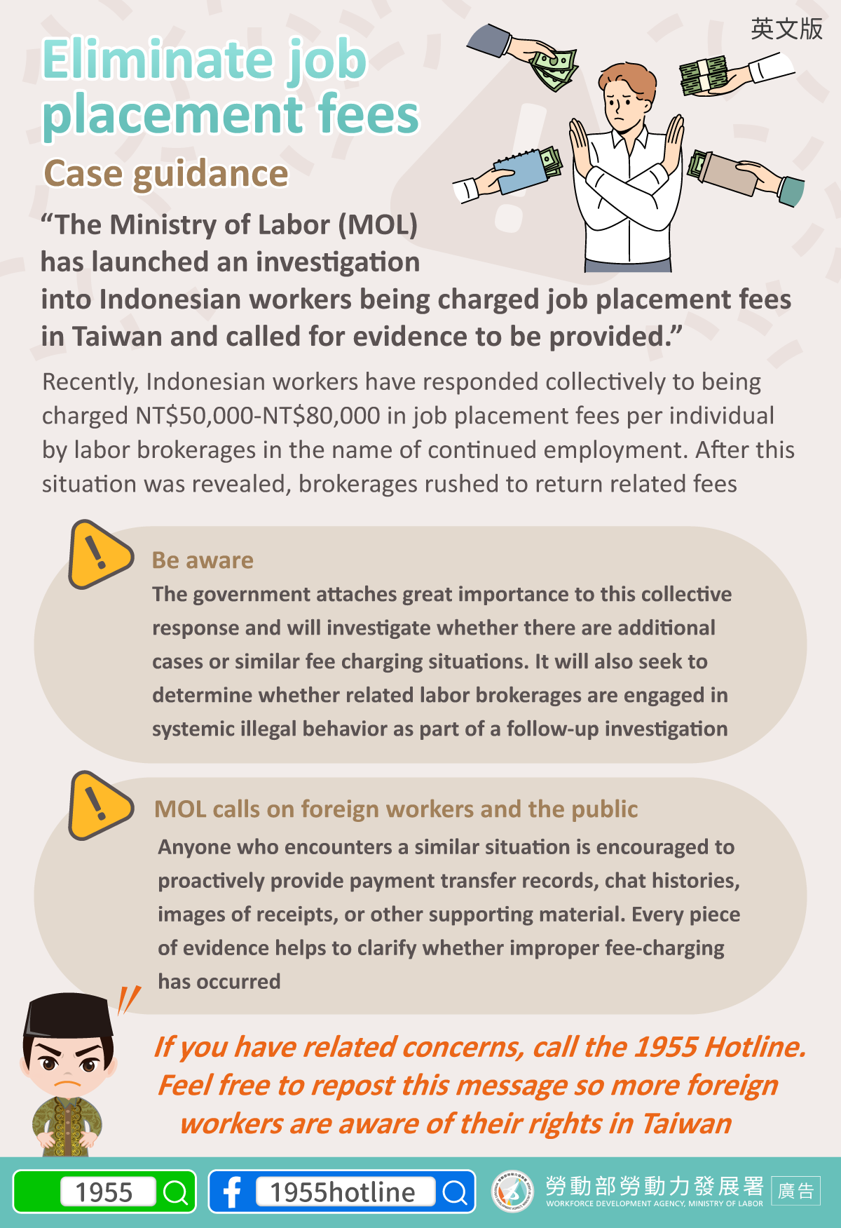 (FWA 2026/02/13)“The Ministry of Labor (MOL) has launched an investigation into Indonesian workers being charged job placement fees in Taiwan and called for evidence to be provided.”