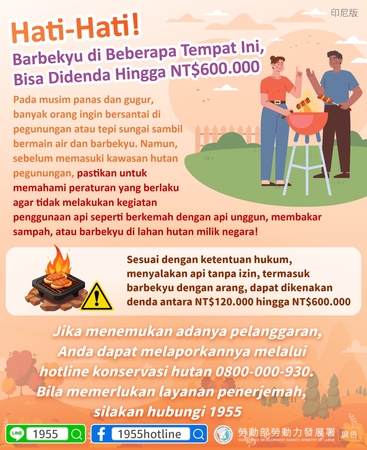 Sesuai dengan ketentuan hukum, menyalakan api tanpa izin, termasuk barbekyu dengan arang, dapat dikenakan denda antara NT$120.000 hingga NT$600.000