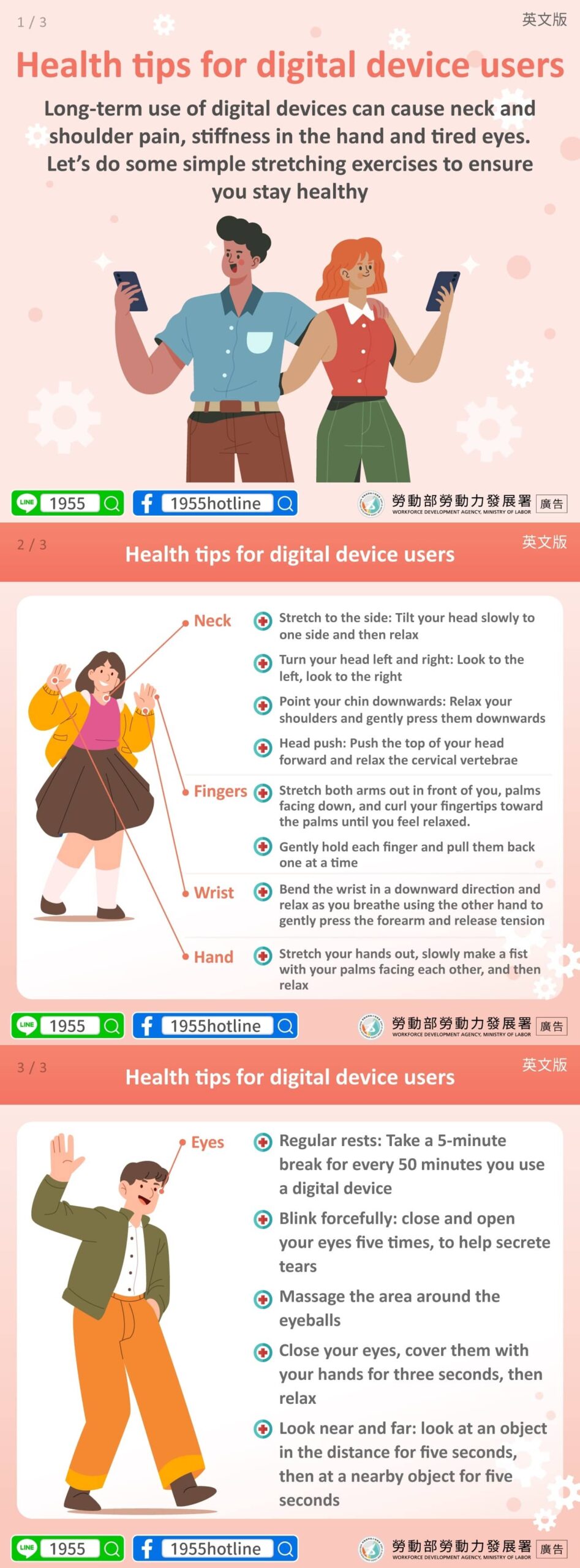 (FWA 2026/03/9)Long-term use of digital devices can cause neck and shoulder pain, stiffness in the hand and tired eyes.