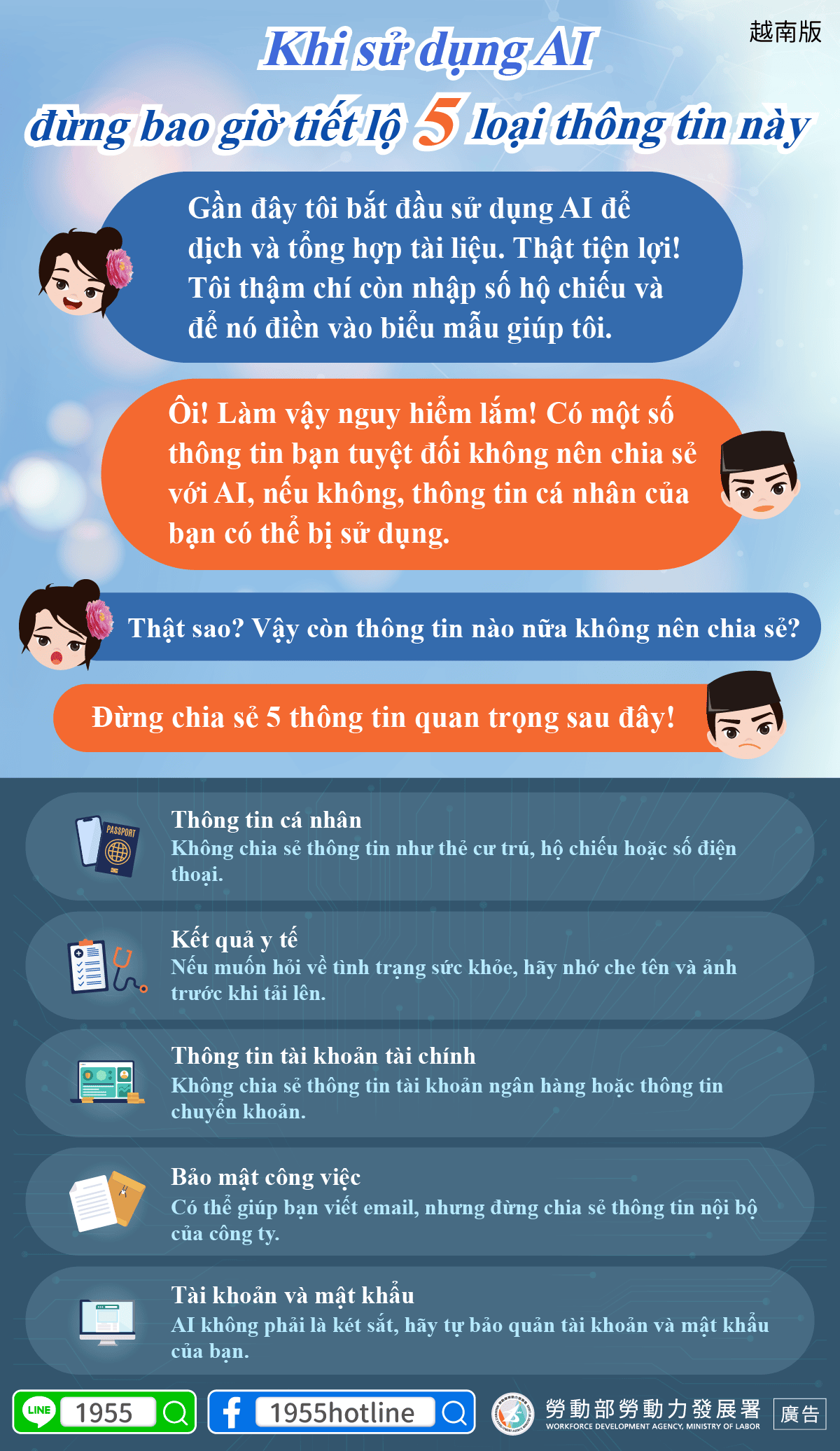 B:Ôi! Làm vậy nguy hiểm lắm! Có một số thông tin bạn tuyệt đối không nên chia sẻ với AI, nếu không, thông tin cá nhân của bạn có thể bị sử dụng.