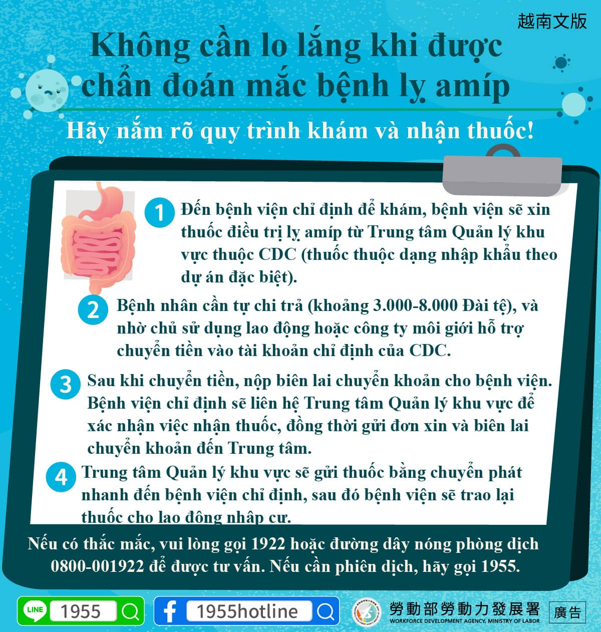 2.Bệnh nhân cần tự chi trả (khoảng 3.000-8.000 Đài tệ), và nhờ chủ sử dụng lao động hoặc công ty môi giới hỗ trợ chuyển tiền vào tài khoản chỉ định của CDC.