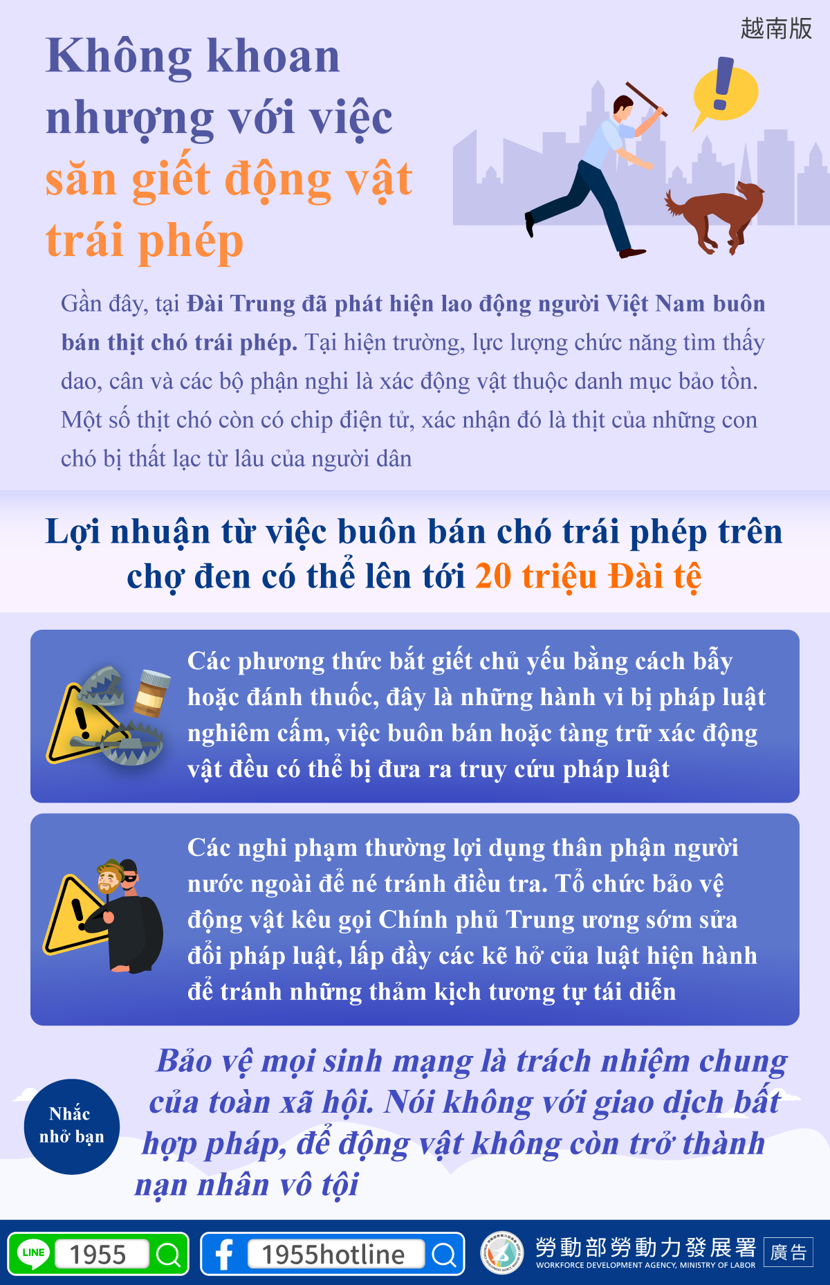 (FWA 2026/02/12)Gần đây, tại Đài Trung đã phát hiện lao động người Việt Nam buôn bán thịt chó trái phép. Tại hiện trường, lực lượng chức năng tìm thấy dao, cân và các bộ phận nghi là xác động vật thuộc danh mục bảo tồn. Một số thịt chó còn có chip điện tử, xác nhận đó là thịt của những con chó bị thất lạc từ lâu của người dân